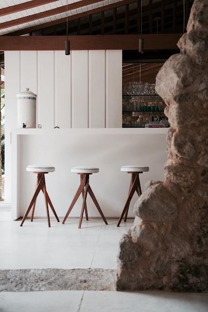 Brut stone pillars, sensual white walls, exotic plants, turquoise sofa or linear white stools ... every detail counts!